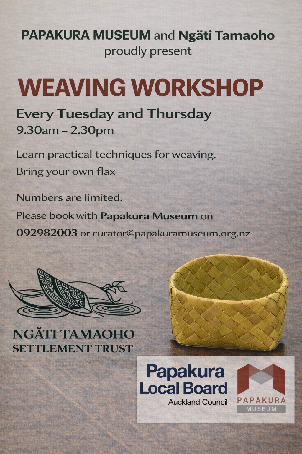 Weaving Workshops every Tuesday and Thursday - 9.30am to 2.30pm. Numbers are limited. Bring your own flax. Book through the Museum phone 09 298 2003 or email: curator@papakuramuseum.org.nz.